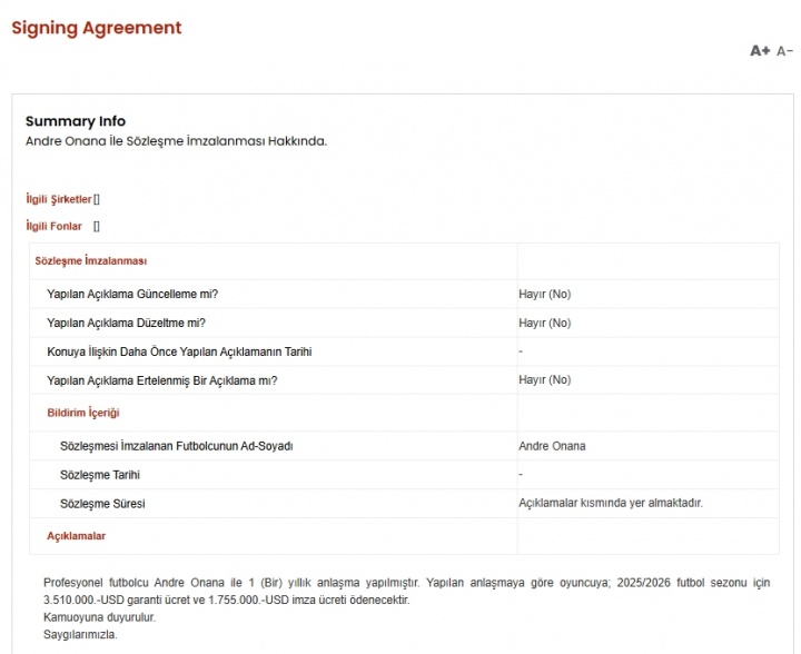 01月 14 2026 0 官方:奥纳纳租借土超的年薪351万美元,签字费175.5万美元 xiaoqiao 2026-01-14 西甲 67 09月12日讯 特拉布宗体育官方宣布,曼联门将奥纳纳租借加盟。据土耳其资本市场委员会(KAP)发布的重大事件披露显示,奥纳纳租借期限为一年,球员基础薪资351万美元,签字费175.5万美元。